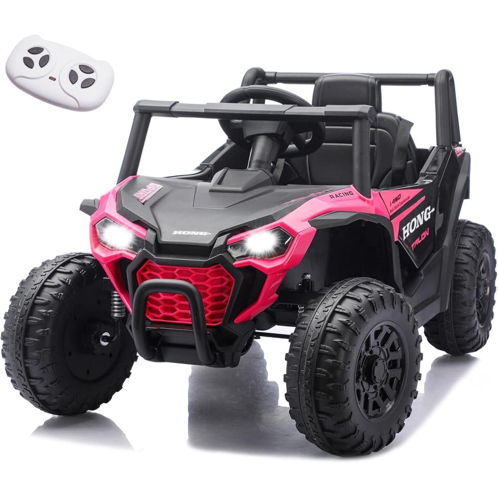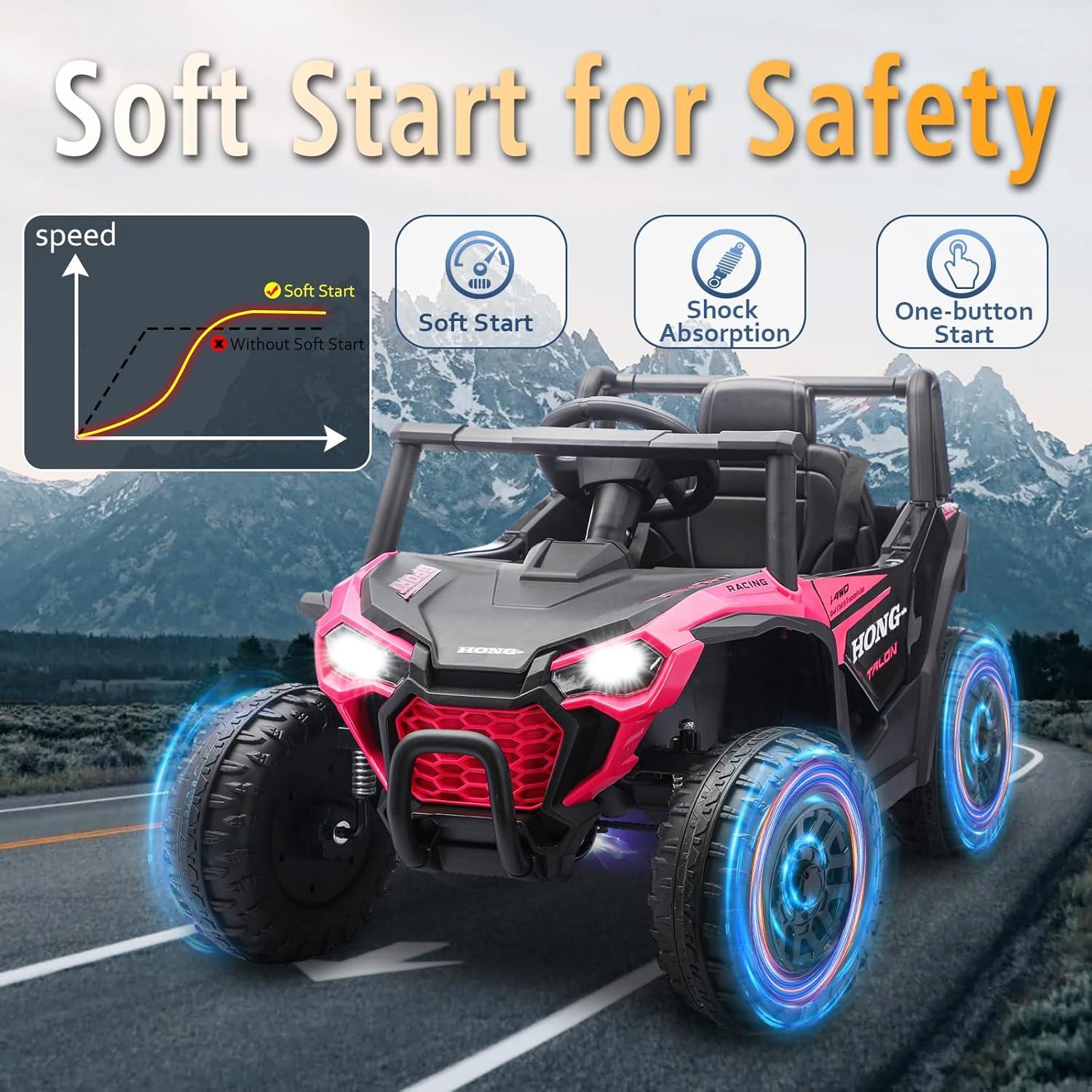 Realistic Driving Experience: POSTACK kids ride on UTV has a 12V battery, bright LED lights, horn & engine sounds, lockable doors, foot pedal acceleration, 4 anti-skid wheels with soft start system, and cool decoration for off-road style, which can attract your kids at first sight. Kids will enjoy driving outside and get a fantastic driving experience.