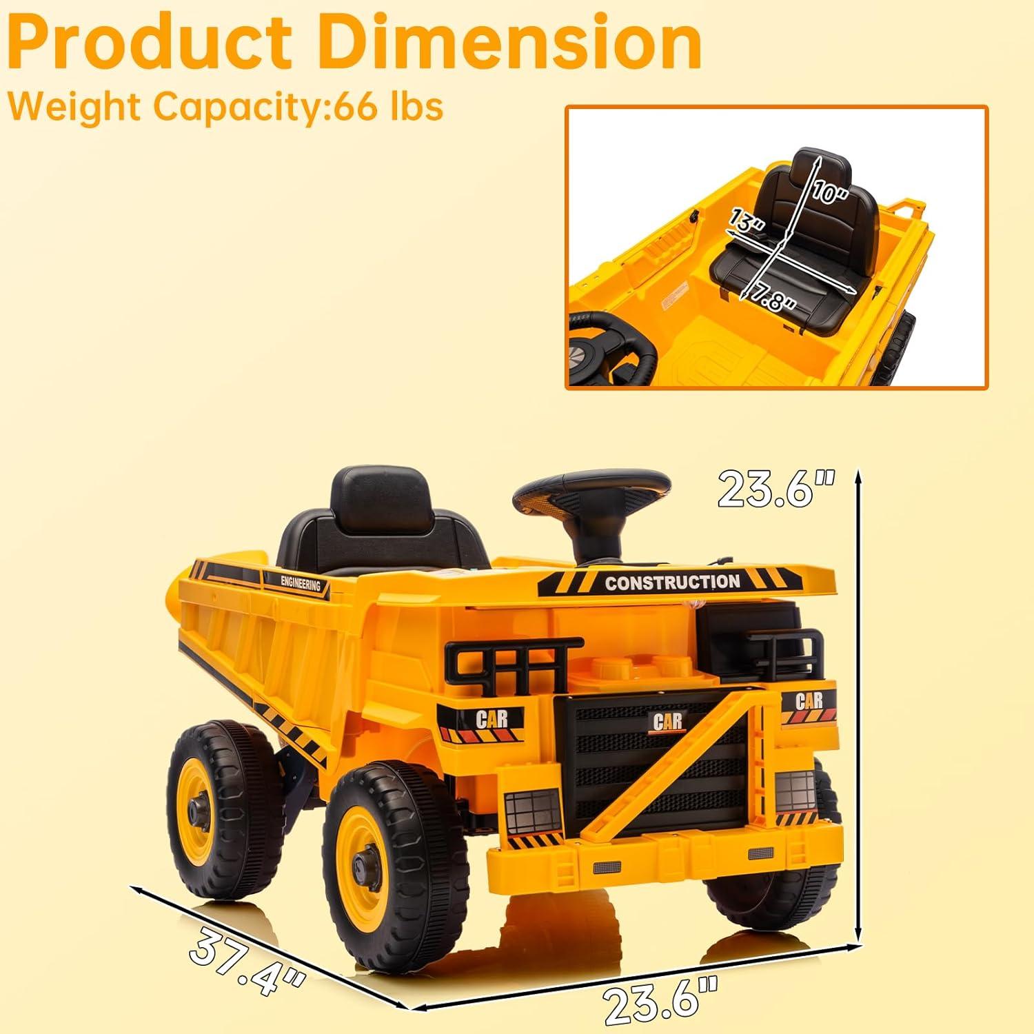 [12V Battery Powered Kids Car] POSTACK kids ride on truck powered by 12V 4.5Ah battery provides long and powerful driving experience. It is suitable for different terrains such as grass, asphalt, and brick road with a speed range of 1.55-2.1 mp/h. Dimension: 37.4”*23.6”*23.6”. Max load 66lbs.