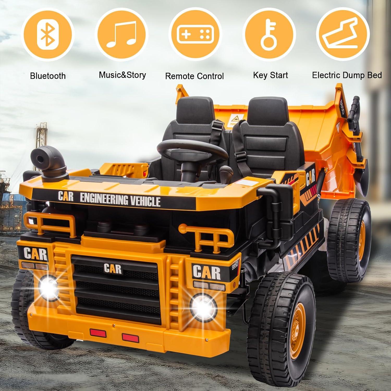 POSTACK 12V Ride On Construction Truck,Battery Powered Ride On Car with Remote Control, Kids Electric Vehicle with Shovel, Speaker, Bluetooth, Music,Boys Girls Gift, 3 Speeds,Blue(Yellow)