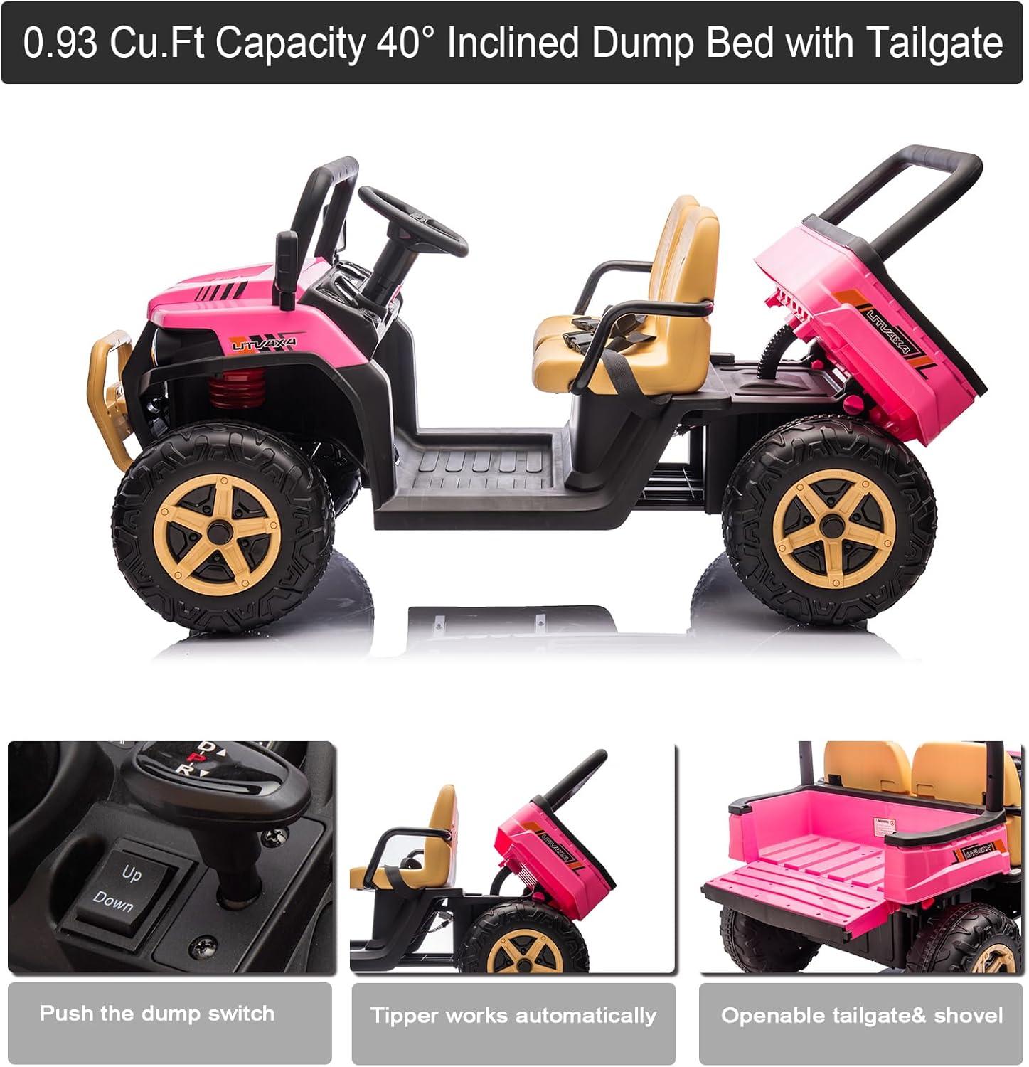 [Automatic Dump Bed] Our real-looking dump truck ride on has an automatic electric lifting dump bed, which can attract your little farmer at first sight! It is easily controlled by a switch. Press up, the dump bed will automatically go up; press down to reset. Your kids will enjoy loading up the trailer and delivering things to enjoy leisure time.