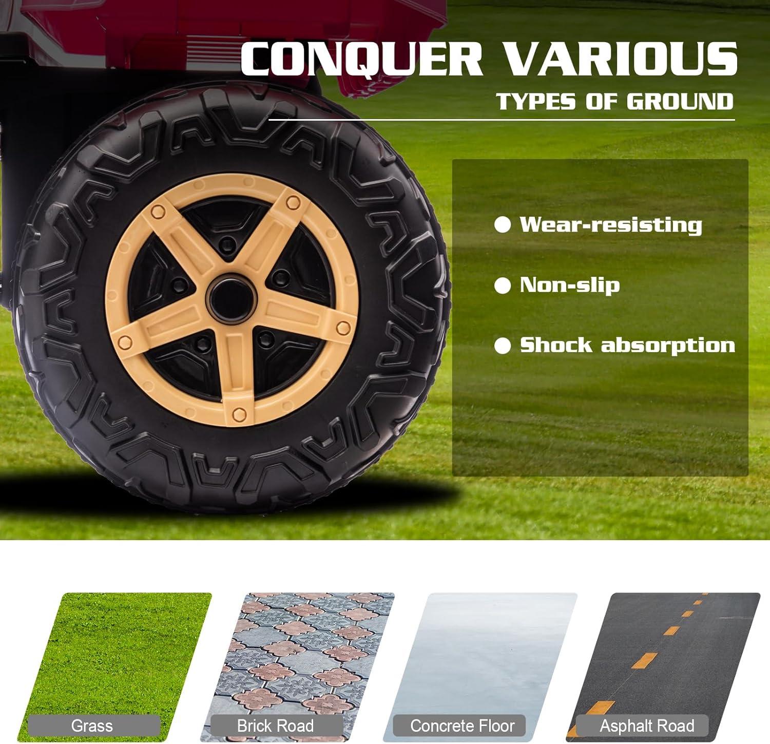[Outstanding Performance] Equipped with a 24 volt strong battery, our tires ride on truck can provide a long using time at the speed range of 2-5mph. The steering wheel, big trailer, bright LED headlights, MP3 player, shift knob and tires offer a realistic driving experience. The wear-resistant wheels allow your kids to ride the car on many kinds of terrains such as grass, brick road, asphalt road and so on.