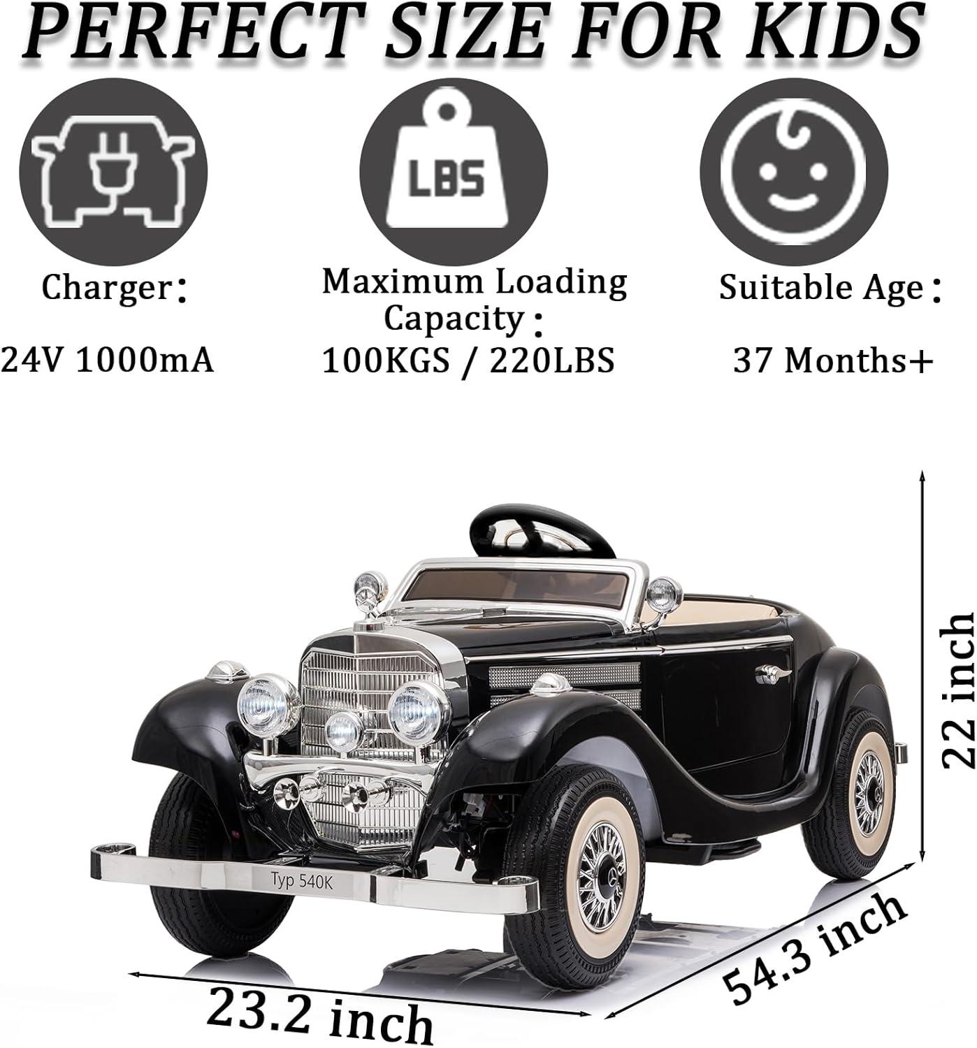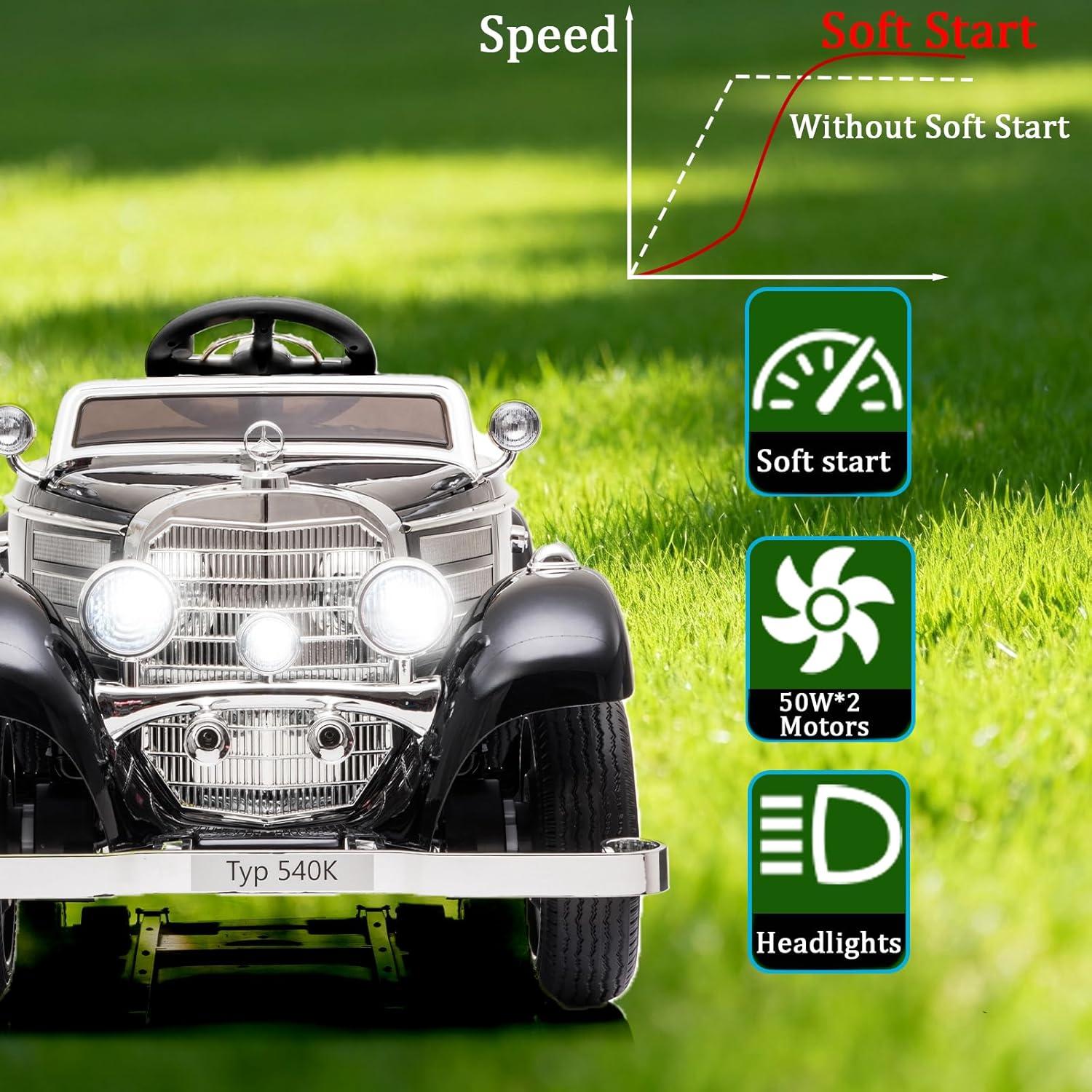 Stylish Ride on Sports Car: POSTACK ride on toy car is moduled by Mercedes Benz. Featuring with streamlined body, retro LED headlights, its authentic classic vintage appearance design will catch your child's attention at first glance. Made of safe PP material and certificated with ASTM/CPSIA, it can be a surprising Christmas and birthday present for your child. Dimension: 54.3 * 23.2 * 22 INCH.