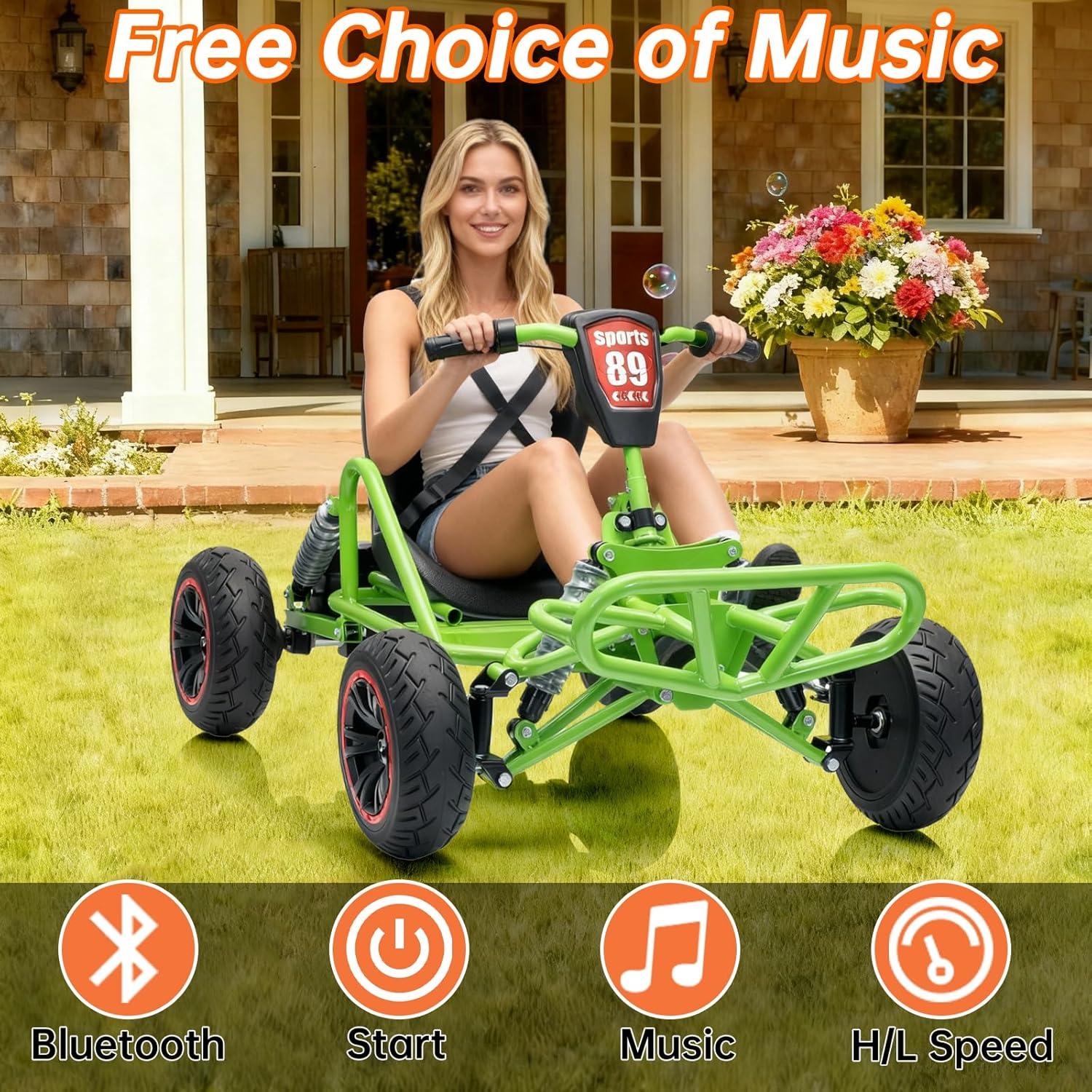 【Comfort & Adjustability】Seat can be adjusted forward and backward across 3 positions to accommodate growing kids. Front and rear hydraulic shock absorbers and EVA tires ensure a smooth and comfortable ride on various terrains such as brick road, gravel road, cement road and asphalt road.