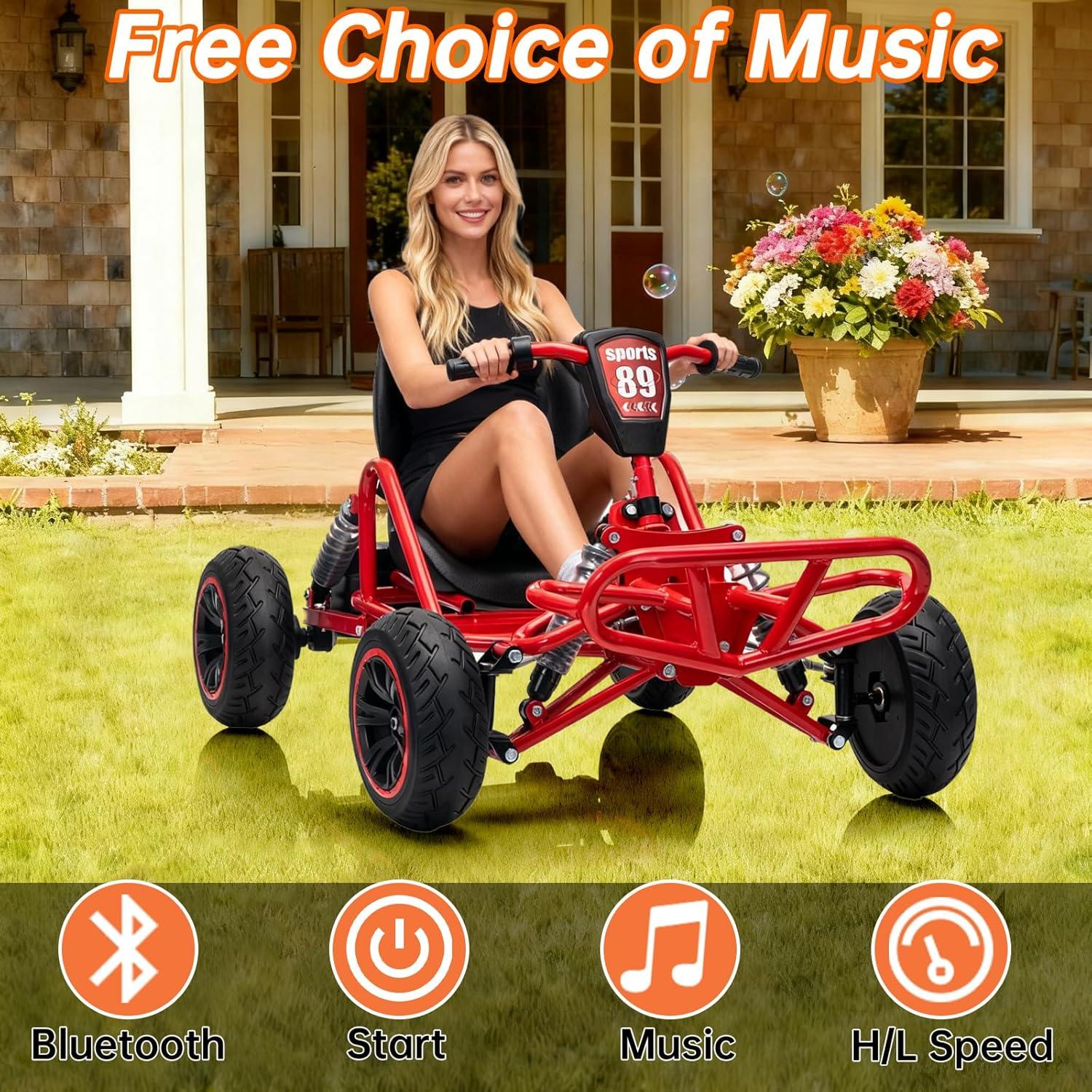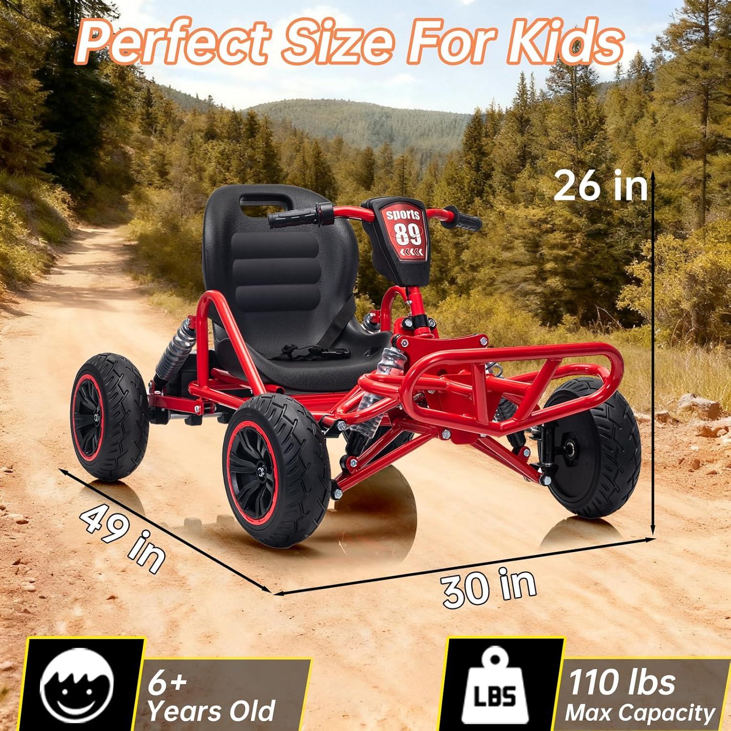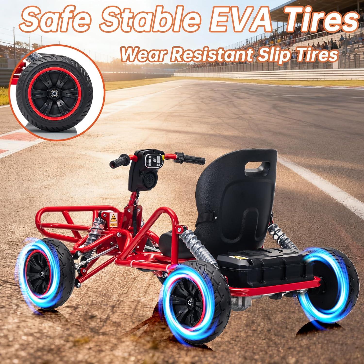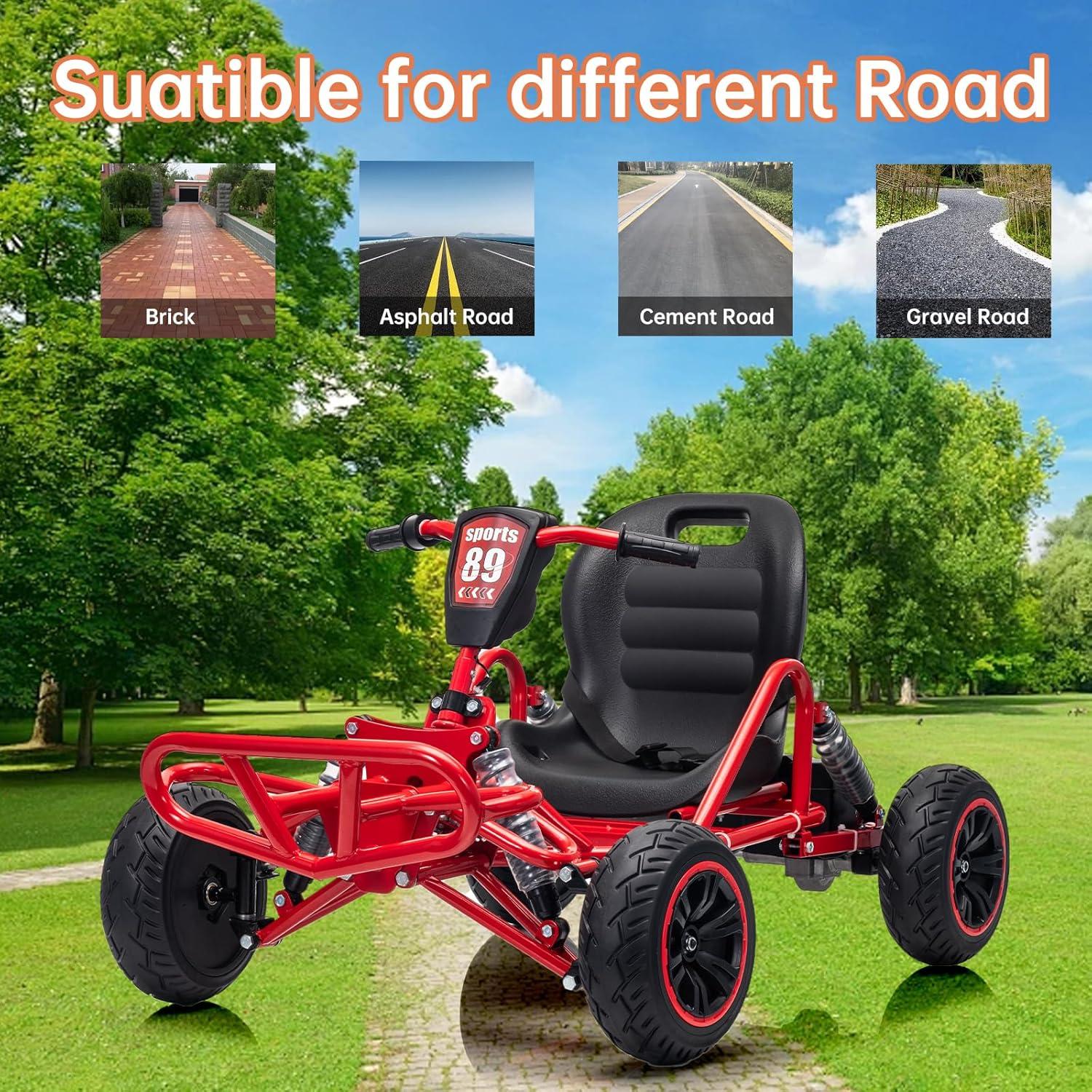 【Comfort & Adjustability】Seat can be adjusted forward and backward across 3 positions to accommodate growing kids. Front and rear hydraulic shock absorbers and EVA tires ensure a smooth and comfortable ride on various terrains such as brick road, gravel road, cement road and asphalt road.